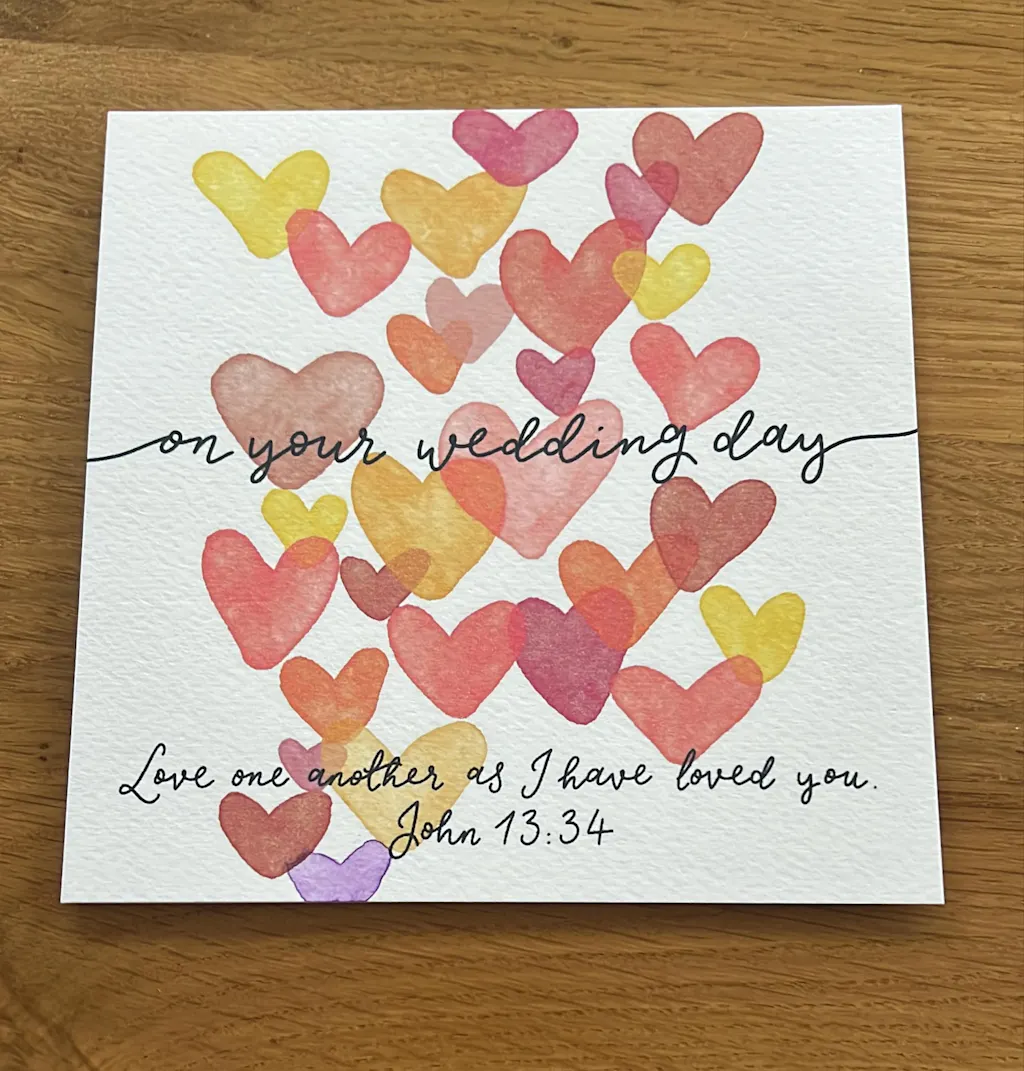 Know a Christian couple getting married soon? Mark the sacred and joyful occasion with this vibrant Christian wedding card, featuring a cascade of watercolour hearts and elegant hand-lettered text that reads: “On your wedding day.” Below, the words of Jesus from John 13:34 offer a beautiful reminder of love’s divine foundation and how we should treat one another, especially in marriage: “Love one another as I have loved you.”