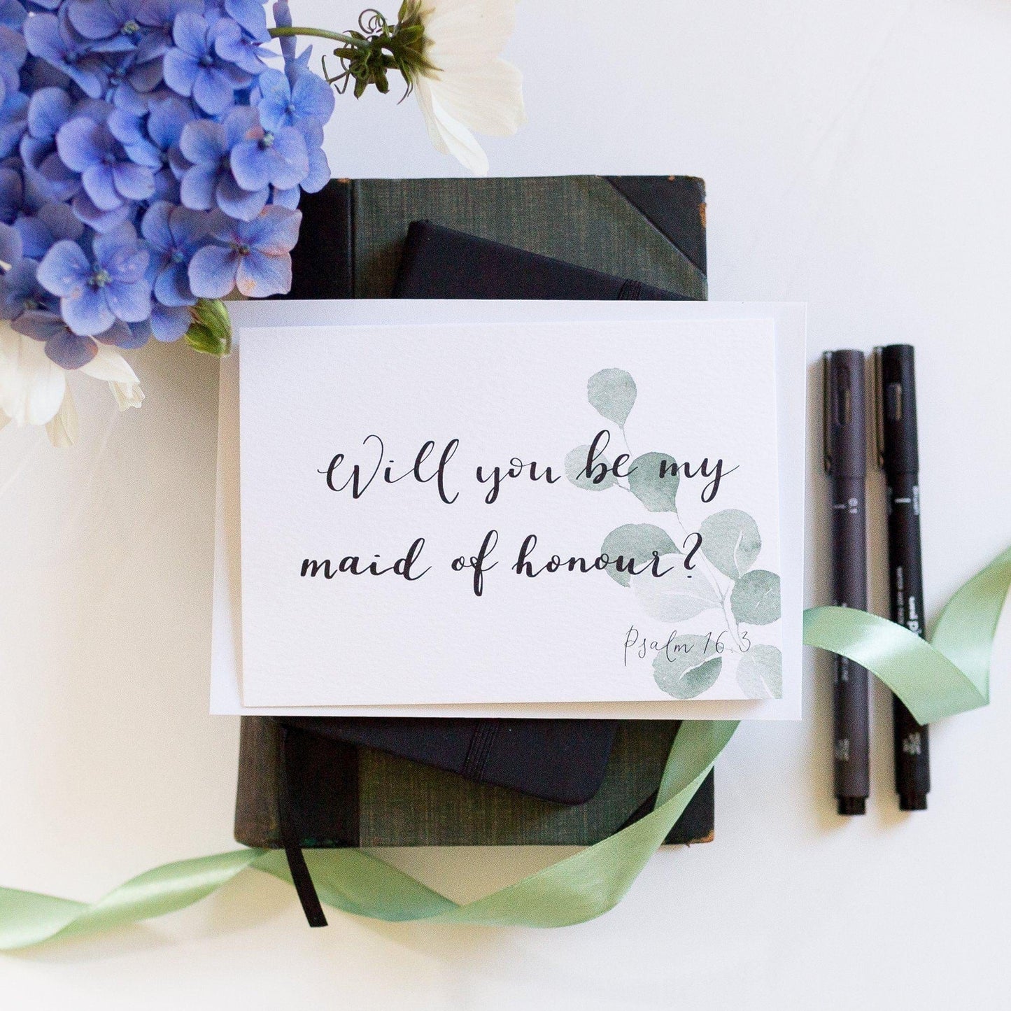 The design is hand lettered in black with a watercolour eucalyptus illustration in a sage green. It is printed on to premium lightly textured paper which makes for a gorgeous luxury A6 card fit for the special occasion asking a friend to be your maid of honour is.