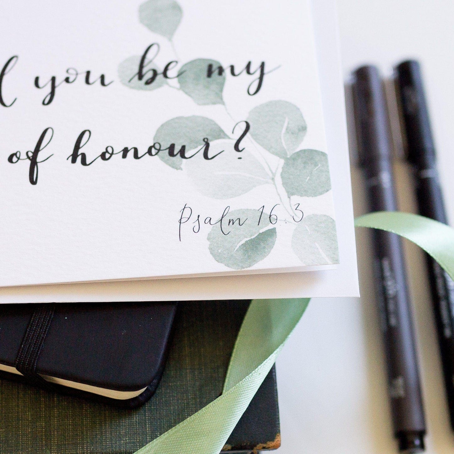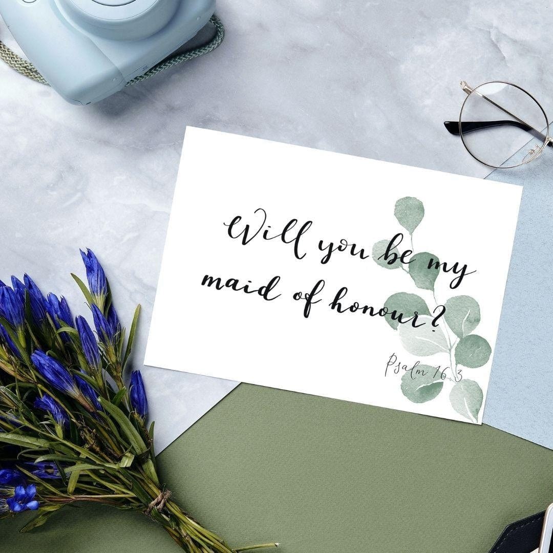 As a Christian, planning a wedding that includes Jesus is such an important thing. When will you have so many of your nearest and dearest around you focusing on you and your life? Show them Jesus and make him present in every aspect of your wedding planning. This maid of honour proposal card includes a verse reference on the front, and the verse is written out in full on the back of the card so even if your maid of honour doesn’t know that verse off by heart she can be encouraged by it there and then.