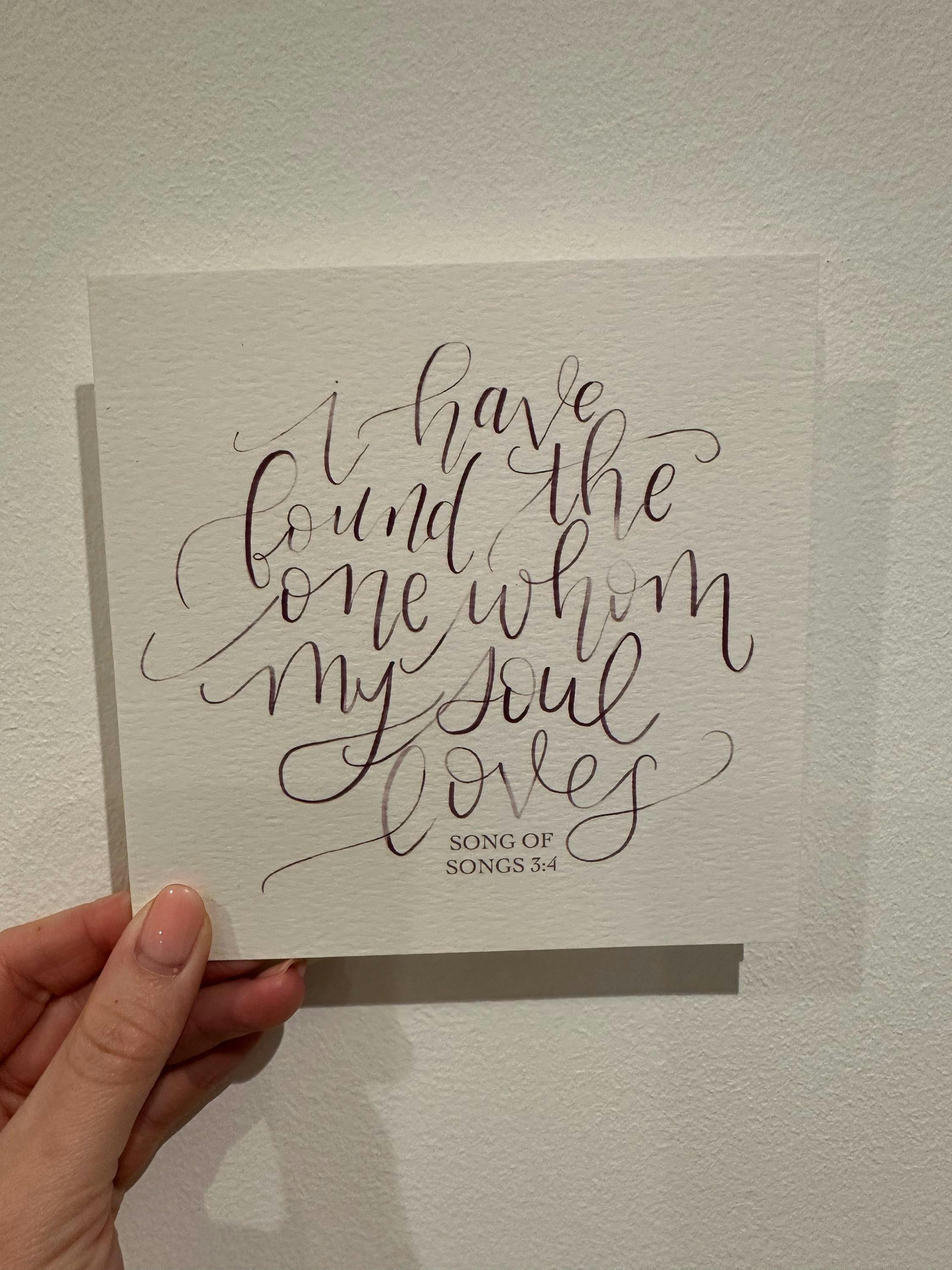 The verse from Song of Songs “I have found the one whom my soul loves” is perfect for so many occasions. The scripture has been carefully hand-lettered in a deep purple on this card, making it perfect to give to a man or a woman.