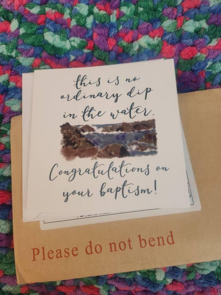 With a pastel illustration of Ballintoy Harbour (Northern Ireland) in the centre of this luxury card, the words “this is no ordinary dip in the water.” and “congratulations on your baptism!” are hand lettered in shades of blue above and below the picture. The card is printed on to premium lightly textured card and it comes with a white envelope. It is blank inside for your own message.